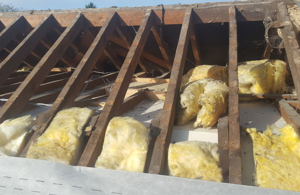 Removal of the old roof is done in stages and always so that the area taken off can be made water tight in the same day. Starting from the top down so that all rubble and detritus can be swept down the existing felt. Each tile is then stacked for reuse or lowered to be discarded. Carpentry work applied where needed to the trusses and valley boards